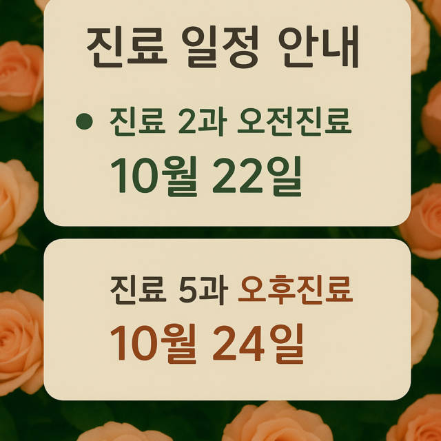 ☞ 휴진 안내 ☜ ■ 2과 (오후)휴진 : 10월 22일(수) ■ 5과 (오전)휴진 : 10월 24일(수) ■ 2과 휴진 : 11월 13일(목) ~ 15일(토), 29일(토) ■ 5과 휴진 : 11월 27일(목) ■ 7과 휴진 : 11월 15일(토), 12월…
