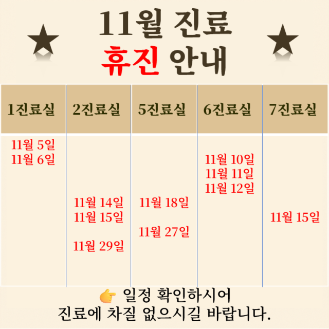 ☞ 휴진 안내 ☜ ■ 2과 휴진 : 11월 13일(목) ~ 15일(토), 29일(토) ■ 5과 휴진 : 11월 18일(화) , 11월 27일(목) ■ 6과 휴진 : 11월 10일(월) ~ 12일(수) ■ 7과 휴진 : 11월 15일(토), 12월…