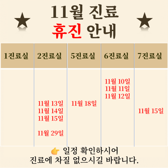 ☞ 휴진 안내 ☜ ■ 2과 휴진 : 11월 29일(토) ■ 7과 휴진 : 12월 6일(토) ☞ 진료 안내 ☜ 1. 일요일 그리고 휴일 당직진료 시에는 초진/임신사전검사 접수 및 예약(전화 등) 불가 합니다. 평일근무 또는 오전근무 시에…