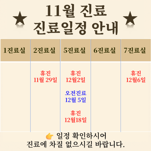 ☞ 휴진 안내 ☜ ■ 2과 휴진 : 11월 29일(토) ■ 5과 오전진료 : 12월 5일(금) ■ 5과 휴진 : 12월 2일(화), 12월 18일(목) ■ 7과 휴진 : 12월 6일(토) ☞ 진료 안내 ☜ 1. 일요일…