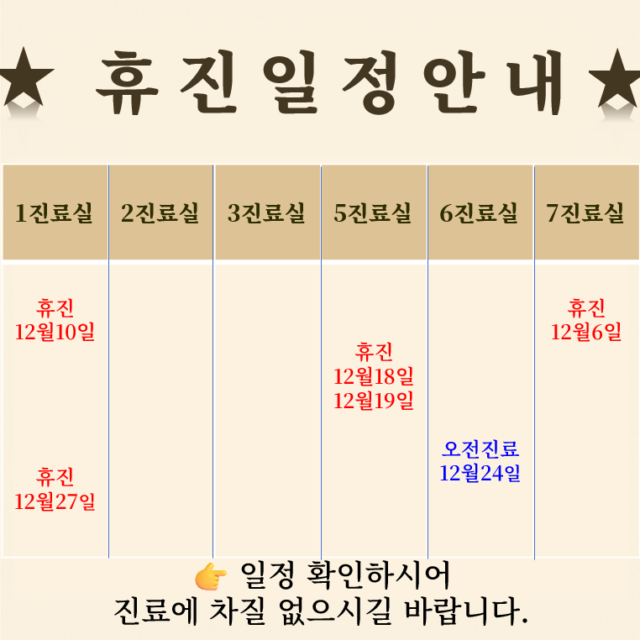 ☞ 휴진 안내 ☜ ■ 5과 종일휴진 : 12월 18일(목), 12월19일(금) ■ 6과 오후휴진 : 12월 24일(수) ■ 1과 진료휴진 : 12월 27일(토) ■ 1과 오후휴진 : 2026년 1월 8일(목) (매주 화요일 오후 휴진을 매주 목요일…
