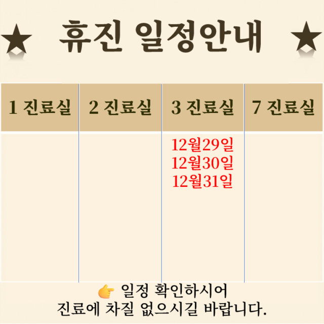 ☞ 휴진 안내 ☜ ■ 3과 종일휴진 : 12월 29일(월)~ 12월31일(수) ■ 1과 오후휴진 변경 : (매주 화요일 오후 휴진을 매주 목요일 오후 휴진으로 변경) ☞ 진료 안내 ☜ 1. 일요일 그리고 휴일 당직진료 시에는 초진/임신사전검사 접수…