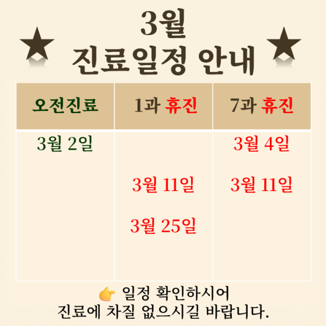 ☞ 휴진 안내 ☜ ■ 1과 휴진 : 3월 11일 , 3월 25일 ■ 7과 휴진 : 3월 04일 , 3월 11일 ☞ 진료 안내 ☜ ■ 2026년 3월2일 : 오전근무(초진/임신사전검사 접수 가능) ■ 2026년 2월20일부터 …
