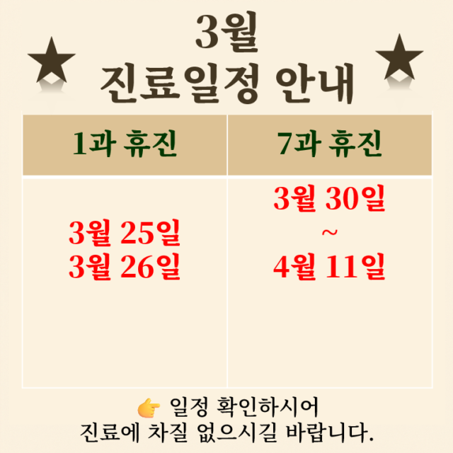 ☞ 휴진 안내 ☜ ■ 1과 오후휴진 변경 : 2026년 1월1일부로 (매주 화요일 오후 휴진을 매주 목요일 오후 휴진으로 변경) ■ 병원 휴무 : 2026년 2월17일 설날 당일 ☞ 진료 안내 ☜ 1. 일요일 그리고 휴일…