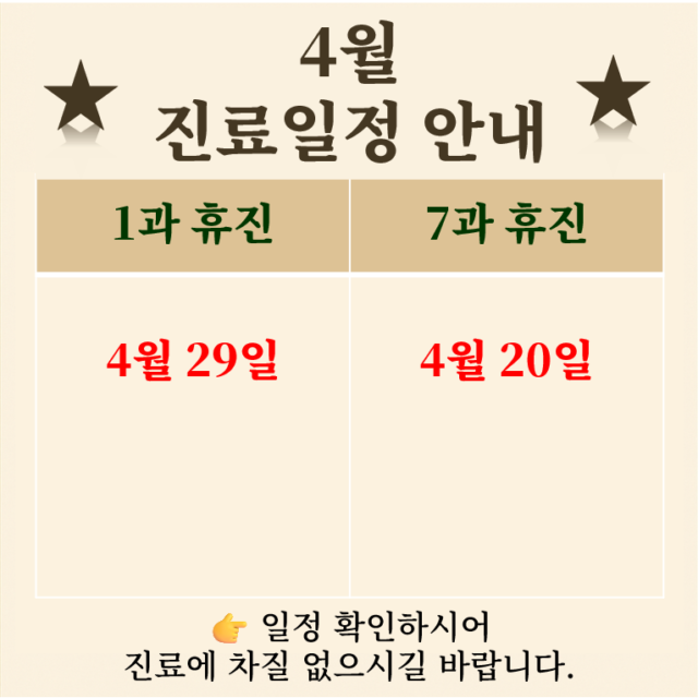 ☞ 휴진 안내 ☜ ■ 1과 휴진 : 4월 29일 ■ 7과 휴진 : 3월 30일~4월11일 ☞ 진료 안내 ☜ ■ 2026년 2월20일부터 의료진(여의사) 증원으로 진료 개시 1. 일요일 그리고 휴일 당직진료 시에는 초진/임신사전검사 접수 및 예약(전화…
